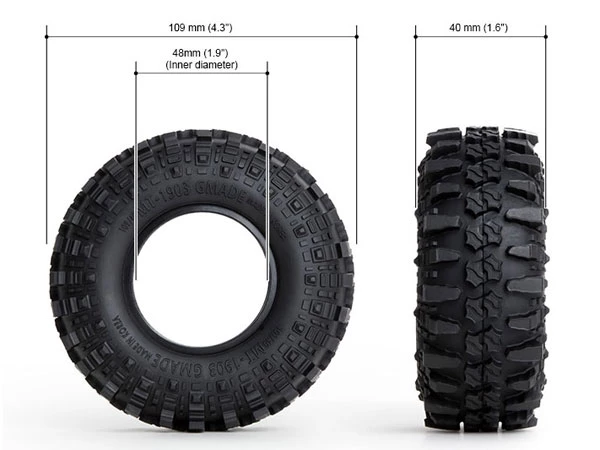 Gmade MT1903 tyres are high grip tyres designed for various rock crawlers & trucks. These tyres are made of super soft compounds for good grip over all kind of terrain. Large, deep lugs provide exceptional traction in rock, mud, and dirt. Fits 1.9 inch size wheels. Sold in pairs. Inner foams are included.
