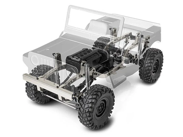 To get the power to the axles, a dust proof transmission is used. The transmission housing features a metal motor mount to keep everything precise and secure. The power is then transmitted to the axles with universal shafts. Just to ensure there is no loss of power every rolling component uses ball bearings. Where is all this power going? Out to the MT-1901 off-road tyres mated to VR01 1.9 inch beadlock wheels. This tyre and wheel combination provides excellent traction in almost any environment. A beautiful clear Lexan scale body with driver seats, steering wheel, shifter, side view mirrors, and a fold down windshield will make anyone green with envy.